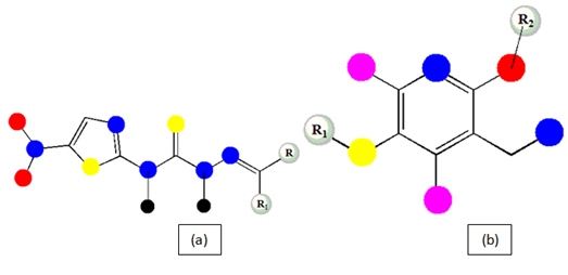 Figure 6 Basic chemical structure of 5-nitrothiazolylthiosemicarbazones (a) and 5-(aryl/cyclohexylsulfanyl)-2-alkoxy-4,6-diarylnicotinonitriles (b).