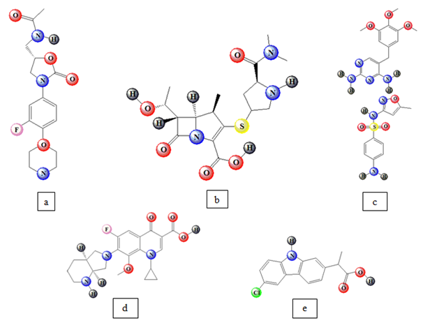 Already present antibiotic drug moieties in the market but indicated primarily for different disease is now being under the consideration for TB drug development process.67,68 Linezolid (Figure 10a) was trialed for many years as an anti-TB drug molecule but now for the toxicity profile and low safety measures, it has been on hold and the other moieties of same class under being considered for studies.67 Meropenem (Figure 10b) which is a carbapenem antibiotic indicated for bacterial disease presently, has been reported for having a promising potential and safety profile of acceptable limits in a case control study of tuberculosis.69 Co-trimoxazole (Figure 10c) which is an antibiotic of early stage antibiotic era has been reported for potent activity in multi-drug resistant tuberculosis treatment.70 Moxifloxacin (Figure 10d) which has shown an appreciable activity along with other standard anti-TB drug can be a potent component in the regimen for drug sensitive tuberculosis for its safety profile and no intractability measures.71 Nextly, one is the NSAID class compounds which are magical and wonder drugs are being evaluated and found to be potent anti-TB active, specifically,carprofen (Figure 10e) has shown the least MIC values. The efficacy, safety, toxicity and acceptability have reviewed on the animal models which conclude to potentially useful for alleviating the symptoms of TB.72