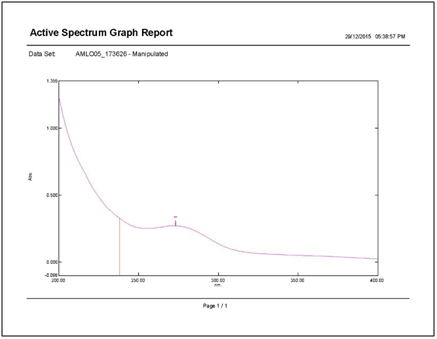The absorption curve showed characteristic absorption maxima at 238nm for amlodipine (pure drug). The resulting spectrum (graph between absorbance and wavelength) is shown in Figure 5.2.1.