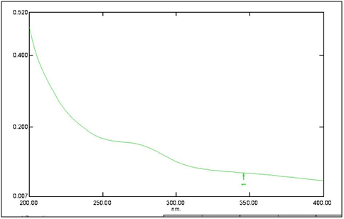 The absorption curve showed characteristic absorption maxima at 355nm for amlodipine (marketed tablet formulation). The resulting spectrum (graph between absorbance & wavelength) is shown in Figure 4.22–28