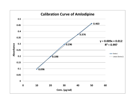 The equation of the calibration curve for amlodipine pure compound was Y = 0.009x + 0.012, the calibration curve was found to be linear with the correlation coefficient (R2) = 0.997.