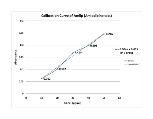 The calibration curve was plotted by taking different concentration of drug on x–axis and absorbance on y–axis and is shown in Figure 6 marketed tablet formulation. The drug (amlodipine) obeys Beer’s law in the concentration range of 10–50μg/ml with coefficient of correlation (R2) = 0.990. And wavelength is 355nm.33,34