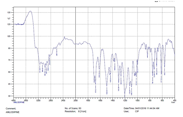 FTIR studies of pure amlodipine drug by using of FTIR instrument. The same amount of drug are used for measurement and KBr used as a alkali halide mixture compound. The range fixed in 4000–200nm. And there functional group and wavelength is determine. Results of functional groups are shown in Table 3.35–37
