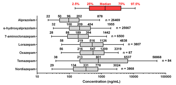 Figure 1 illustrates the data post filtering for the benzodiazepines of interest in this work as described above. The graph is displayed on a logarithmic scale so that the plots for all of the benzodiazepines can be displayed in the same graph. However, that is strictly a function of the display and has no bearing on the actual data or how it was calculated. Nothing in this display reflects a “normal” distribution as expected from previous data displays from UDT15-24 and is why box and whiskers plots were chosen to display these data.