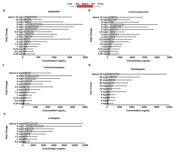 Figure 3 (a) Alprazolam concentration ranges with corresponding dose levels. (b) α-hydroxylprazolam concentration ranges with corresponding dose levels. (c) 7-aminoclonazepam concentration ranges with corresponding dose levels. (d) Lorazepam concentration ranges with corresponding dose levels. (e) Nordiazepam concentration ranges with corresponding dose levels.