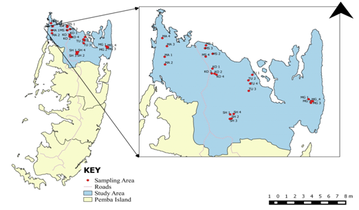 In general, the climate of Pemba is shaped very much by the trade winds of the tropical Monsoon system and movement of convergence zone. It is characterized by tropical climate. The average annual temperature 26°C and average annual rainfall varies between 000 - 2250mm. The soil of Zanzibar is generally very permeable owing to sand and coral type of soil.10 Therefore any waste materials discharged into the ground without treatment can easily leach to groundwater. The study was conducted in six wards of Micheweni district. These include Konde, Msuka, Shumba Viamboni, Makangale, Tumbe and Maziwa Ng’ombe. Both these wards are found in Northern part of Pemba. Micheweni-district located at 5o 2’ 0”S, 39o 45’ 0”E. It had a population of 103,861 in 2012 with annual growth rate 5% which is greater than the national average of 3.1%.11