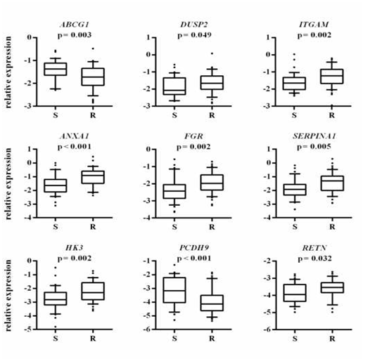 A frequently identified duplication was the change localized on chromosome 21 in bands q21.1-q22.3. For genes encoding ADAM family proteins, located in the band p11.22 of chromosome 8, an amplification was observed, which can contribute to significant changes in the proteolysis of proteins and cell adhesion. Moreover, among the duplicated genes there are genes encoding adhesion molecules, integrins, immunoglobulin receptors, genes involved in the proteolysis of proteins, i.e. metallopeptidase and transporters of the ABC family. Genes affecting T, B and NK lymphocyte activation, actin cytoskeletal organization and the growth, differentiation, and migration of cells, where mainly subject to deletion. In addition, we conducted another analysis which took into account the location of genes from the transcriptomic profile. On this basis, a significant over-expression of genes located on chromosomes 1, 2, 10, 12, and a decrease in the level of expression on chromosomes 20, 21 and 22 were found (Figure 3 in Supplemantary). qPCR results. This step was performed in order to verify the selected matrix genetic markers. Twenty of them were tested (Table 2 in supplementary materials), however, the greatest significance was obtained for 9 of them (Figure 2). Simultaneous decrease in expression for ABCG1 and PCDH9, and increase in expression for DUSP2, ITGAM, ANXA1, FGR, SERPINA1, HK3 and RETN were found in the CP-resistant blasts.