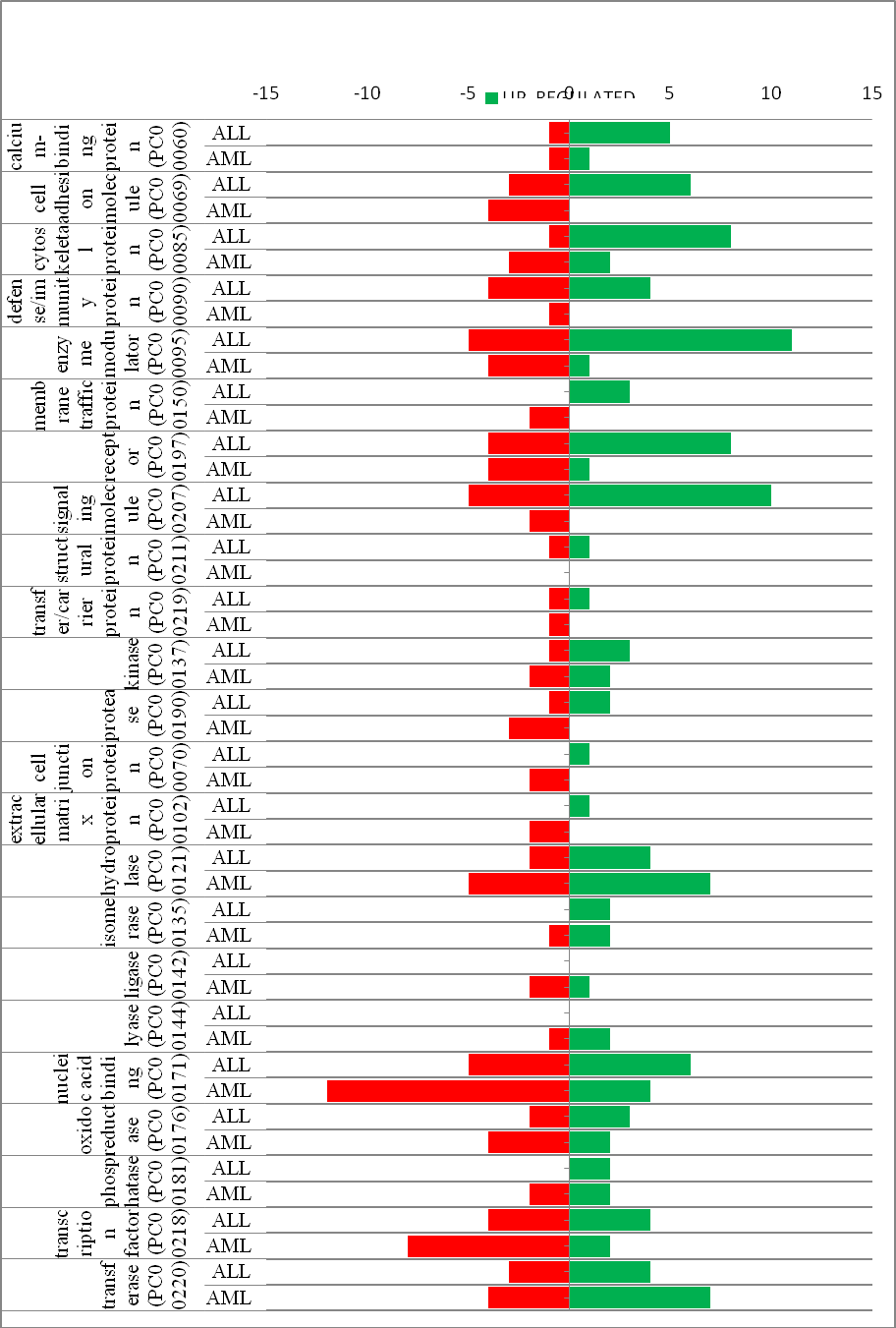 We assigned the differentially expressed genes to biological and functional class. In the case of molecular functions most common in resistance patterns, genes performing functions related with catalytic, receptor activity and nucleic acid binding were represented. For ALL there were changes in the expression level of genes, such as: enzyme regulator activity hydrolase activity, protein binding and especially the receptor activity. In the case of AML profile genes: transferase activity hydrolase activity and DNA binding or nucleic acid binding transcription factor activity were dominated (Figure 1). The biological analysis of the ALL profile mainly concerned genes involved in cellular component organization or biogenesis, and in the case of AML, genes that function in the metabolism of the compound containing the nucleobase of the protein transport, or transcription from the RNA II polymerase promoter and the process of cell protein modification. Characteristic feature of ALL profiles was the increased expression of genes for the membrane movement protein, phosphatase signaling molecule or cytoskeletal protein Figure 1 supplementary materials. On the other hand, in AML we more often observed a decrease in the expression of gene groups belonging to the cell adhesion molecule, enzyme modulator, protease and transcription factor (Figure 2 supplementary materials).