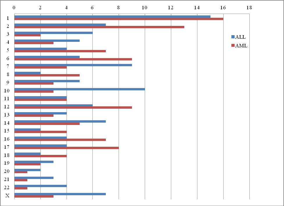 Figure S3 Distribution of all of the analyzed genes of the transcriptomic profile for ALL and AML on individual chromosomes.