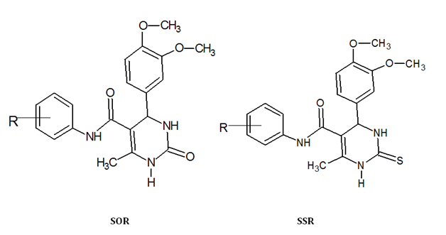 Synthesis of dihydropyrimidinone derivatives: (i) Synthesis of 3, 4-dimethoxybenzaldehyde: An aqueous solution was vanilline was refluxed for half an hour with stirring at 100 ̊C. To this solution, few drops of NaOH and dimethyl sulphate were added slowly and the reaction mixture was again refluxed with stirring for about 4 hours. In this reaction mixture, diethyl ether was added and the solvent was evaporated to get the crude product 3,4-dimethoxybenzaldehyde. (ii) Synthesis of 3-oxa-N-phenylbutanamide: To an equimolar mixture of substituted aniline and ethyl aceto acetate in toluene, few drops of NaOH solution was added and the solution was refluxed for 12 hours. The excess of toluene was distilled out and the reaction mixture was taken in hexane and stirred. The product was isolated and was dissolved in NaOH solution. This solution was then neutralized with dilute hydrochloric acid and product was separated. (iii) Synthesis of 4-(3,4-dimethoxyphenyl)-6-methyl-2-oxa-N-phenyl-1, 2, 3, 4-tetra hydropyrimidine-5-carboxamide: A methanolic solution of 3, 4-dimethoxy aldehyde, substituted diketones and urea was refluxed for 12 hours using conc. HCl as catalyst. After the completion of reaction, product was isolated and recrystallized from ethanol. Similarly other compounds were synthesized.