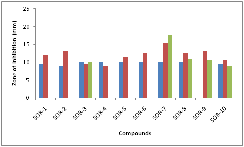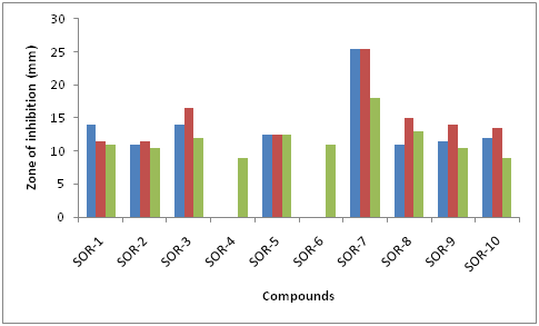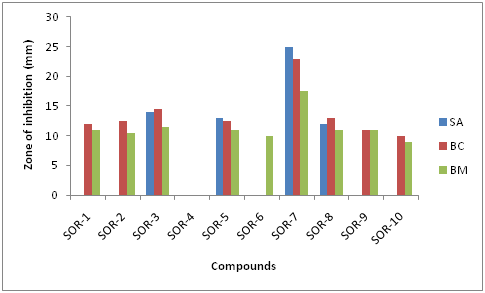 In DMF, zone of inhibition against Gram positive bacteria is given in Figure 3. It is observed that again SOR-7 showed maximum inhibition for all the three bacterial strains. For S. aureus and B. cereus, SOR-4 and SOR-6 shows no inhibition at all whereas for B. megaterium, all the compounds show inhibition.