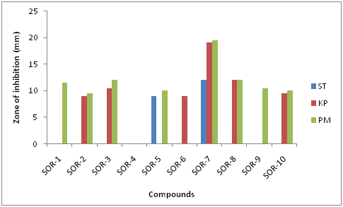 Figure 5 shows the zone of inhibition against Gram negative bacteria in DMF. Against all the three bacteria, again SOR-7 exhibited maximum inhibition. For S. typhimurium, inhibition is quite less in comparison to other two Gram negative bacteria; K. pneumonia and P. mirabilis. For this strain, inhibition is more or less same for all the compounds except SOR-9 which had no effect on this bacterium. The comparison of inhibition of SOR-9 (containing 3, 4-dichloro substitution) with that of SOR-7 (containing 2, 5-dichloro substitution) suggests that position of substitution also plays an important role in inhibition. For K. pneumonia, all the compounds show inhibition and maximum inhibition is observed for SOR-7 containing 2, 5-dichloro substitution. Against P. mirabilis, SOR-10 exhibited minimum inhibition. SOR-1, SOR-2, SOR-4, SOR-5 and SOR-6 showed no inhibition at all. Thus, in DMF K. pneumonia is the most susceptible bacteria and compound with chloro substitution at 2nd and 5th position is most effective. So, overall, in SOR series, DMF is good solvent and nature and position of substituent play important role in inhibition.