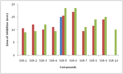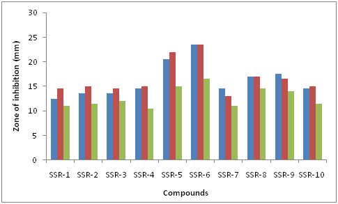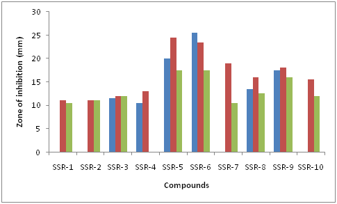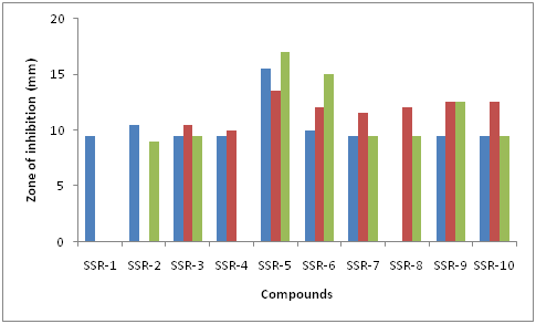 Figure 7 shows the zone of inhibition against the Gram positive bacteria in DMF where all the compounds exhibited inhibition against studied bacterial strains. However, again SSR-6 containing 4-fluoro substitution showed maximum inhibition for all the three bacterial strains.