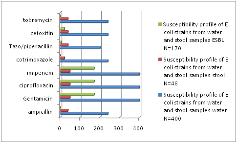 Results: A total of 500 water samples and 150 stool samples were screened for coli. E. coli was found in 80% of the water samples and 32% of the stool samples. Of the water samples, 40% were of the isolated strains was β-Lactamase positive and 21% from the stool strains respectively. The non β-lactamase producing isolates were susceptible to most of the antibiotics including meropenem, imipenem, ciprofloxacin and gentamicin. The ESBL strains were only susceptible to meropenem, imipenem, ciprofloxacin and gentamicin. Table 1 shows the comparisons of the susceptibility profiles of E. coli from water and stool samples. The results show a similar pattern in susceptibility profile of strains from water and stool samples.