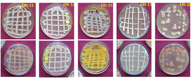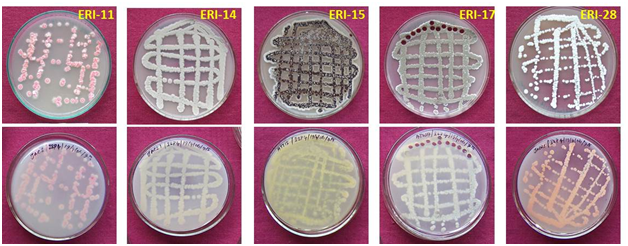Five isolates namely ERI-11, ERI-14, ERI-15, ERI-17 and ERI-28 were identified as the most active isolates. Growth characteristics of these five isolates were studied on different international Streptomyces project media (ISP-2 to ISP-5). The best medium was used for growing the isolates for crude extract preparation from their culture broth.