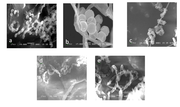 The scanning electron micrograph of active isolates showed the nature and structural differences of spore and hyphal morphologies between the five species. The typical characteristics of Streptomyces were seen and chains of spores were straight or coil (Figure 4). The size of the spores of the active actinomycetes ranged from 0.85 to 2.0µm and the spores were smooth for ERI-11, ERI-14 and ERI-28. The ERI-15 strain had warty spore coiled in chains of 5-10 spores. The spiny spores in chains of more than 10 numbers were found in ERI-17 and the retinaculum apertum of ERI-11 showed warty surface; ERI-14 and ERI-28 were smooth surface in nature but spores appeared as hanging bunch whereas ERI-28 showed chain like smooth spores. These observations were further confirmed in 16s rDNA sequence analysis. The results obtained from this sequence analysis confirmed ERI-11 as Actinomadura sp. which had 99% sequence similarity to Actinomadura sp. (EU274357); the nucleotide substitution was 0.005. The isolate ERI-14 was identified as Salinisporaarenicola, which had 99% similarity to the sequence of Salinispora sp. (GQ163717); the nuleotide substitution was 0.0015; this substitution was more relevant since this isolate was confirmed upto species level as Salinosporaarenicola. When compared with other S.arenicola the similarity was 96%. ERI-15 and ERI-17 were identified as Streptomyces sp. and had 99% similarity with Streptomyces sp.; ERI-17was 100% similar to Streptomyces rochei (FJ486442). The GenBank accession numbers for ERI-11, ERI-14, ERI-15, ERI-17 and ERI-28 were GU998794, JF836083, FJ705810, HQ127628 and JF836082, respectively.
