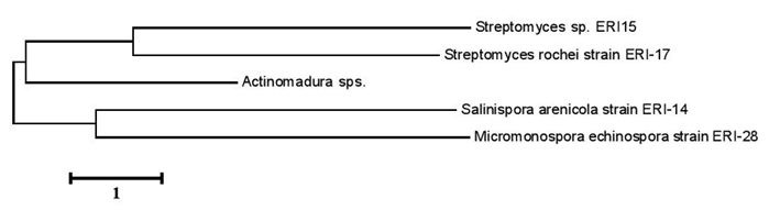 The phylogenetic tree constructed with the five sequences of active isolates is shown in Figure 5. The tree with the highest log likelihood (-4551.5890) is shown. The tree is drawn to scale, with branch lengths measured in the number of substitutions per site. ERI-15 and ERI-17 occupied the same clade; both were belonging to Streptomyces and were closely related. ERI-14 (Salinisporaarenicola) and ERI-28 (Micromonosporaechinospora) occupied the same clade.