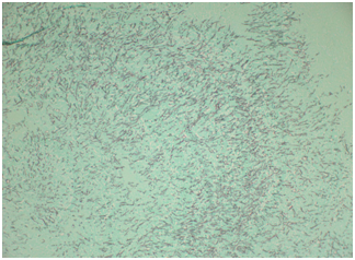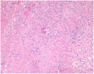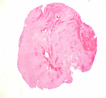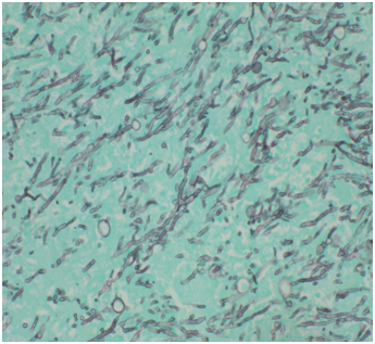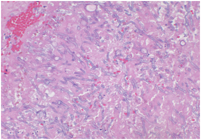 A 57-year-old white male patient with known history of coronary artery disease, morbid obesity, obstructive sleep apnea, hypertension, hyperlipidemia, atrial fibrillation, and tobacco use, presented to a local emergency room with a sudden sharp right arm pain, followed a few hours later by numbness of the right hand. His physical exam was normal except for a very weak pulsation of the right brachial artery. His initial workup included a normal chest x-ray with no acute cardiopulmonary process. A doppler ultrasound of the right upper extremity indicated thrombosis with near-complete occlusion of the distal right brachial artery. He was urgently seen by vascular surgery and underwent thrombectomy of the distal right brachial artery thrombus that was sent for pathology. Hematoxylin Eosin stain and Grocott’s methenamine silver stain showed fungal organisms identified at the thrombus, that had thin septate hyphae with regular branching and that were morphologically consistent with Aspergillus species (Figures 1-6). Subsequently, he was started on intravenous voriconazole, after his EKG, liver function tests were evaluated revealing a normal QTc interval, and liver enzymes respectively. Patient was then evaluated for evidence of disseminated Aspergillosis. His blood cultures have been negative. Aspergillus galactomannan antigen was negative, and his HIV ½ Antibody screen was negative. A computed tomography (CT) scan of the chest with angiography showed an ascending aortic pseudoaneurysm with large soft tissue component, representing a mycotic aneurysm. The contrast opacified lumen of the pseudoaneurysm measured 2.8 x 3.8 cm and there was a portion of the pseudoaneurysm more superiorly that was thrombosed measuring 6.3 x 7.2 cm (Figures 7 & 8). His lungs were clear without evidence of pulmonary nodules or consolidation. CT scan of the brain with contrast and a complete ophthalmological examination were unremarkable. Transthoracic and transesophageal echocardiograms showed no major cardiac finding and no evidence of valvular vegetations. He was then transferred to a tertiary care center where he underwent a homograft of cryopreserved human tissue given the fact that he has an infected mediastinum. He was continued on Voriconazole orally, and he will receive it for life.To note that, five years prior to this event, he underwent an urgent coronary artery bypass grafting (CABG)X3 with reversed autogenous saphenous vein graft from the aorta to the left anterior descending artery, from the aorta to the ramus intermediate, from the aorta to the obtuse marginal artery, along with endoscopic vein harvest left and right greater saphenous veins (from knee to groin bilaterally).