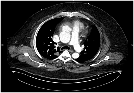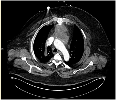 Our patient represents one of the rare cases of invasive Aspergillosis in the setting of a history of previous CABG 5 years prior to this infection. Fungal aortitis remains a rare disease occurring mostly in patients with predisposing host conditions. Aspergillusaortitis is an uncommon infection with high mortality and has been reported in several cases in the literature following surgical procedures, mainly cardiopulmonary bypass. While invasive Aspergillosis occurs typically in severely immunocompromised patients, cases of surgical site infection have been reported in immunocompetent individuals. Underlying immunosuppressive disorder is not necessary. The source is presumed to be airborne infection during the surgical procedure. Special care of the ventilation system in the operating room is necessary to prevent such infection.2,3 The clinical presentation is usually with septic symptoms including fever, night sweats and lethargy. This patient did not present with the classical symptoms, but rather was asymptomatic until symptoms of ischemia to the right upper extremity started secondary to arterial embolism. He also did not have any respiratory symptoms or skin lesions. He did not have a prolonged hospitalization. He has no history of intravenous devices or intravenous drug use.