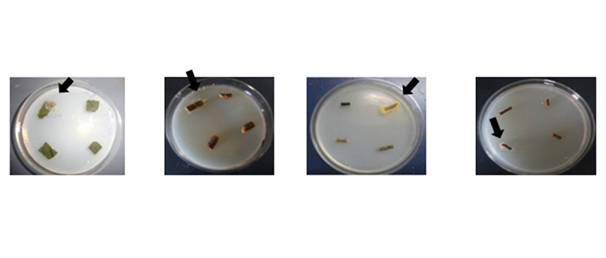 After thorough washing, the samples were air dried under sterile conditions. The surface treated samples were cut into small pieces (1 cm) with a sterile blade and inoculated into Starch Casein Nitrate Agar (SCNA), 2.5% Water Agar (WA), Tap Water Yeast Extract Agar (TWYE) and Tap Water Peptone Agar (TWPA). The inoculated plates were then incubated at 30˚C for 3-4 weeks. Morphologically distinct isolates were subcultured till pure cultures were obtained.