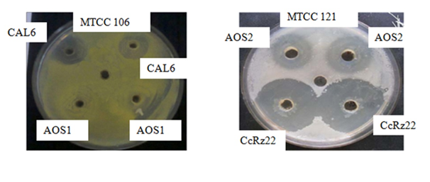 All 37 bioactive actinomycete strains were subjected to secondary screening for antibacterial activity against the same bacterial test organisms. Eleven (11) endophytic strains showed antimicrobial activity against one or more of the test organisms of which 4 strains (CcRz22, CaL6, CaR5, AoS2) were found to be promising. None of the isolates showed any activity against Pseudomonas aeruginosa. (Table 2 & Figure 3).