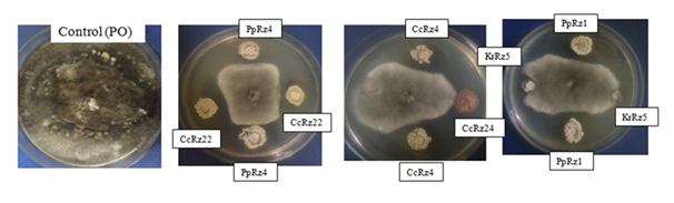 Biocontrol assays against fungal pathogens (Dual Culture Method): The bioactive strains were screened for antifungal activities against major rice fungal pathogens viz. Curvularia oryzae (MTCC 2605), Rhizoctonia solani (MTCC 4633), Aspergillus niger (MTCC 1344), Bipolaris oryzae (LSMU1), Fusarium oxysporum (MTCC 287) and Pyricularia oryzae (MTCC 1477) using the Dual culture method.37