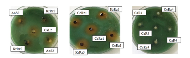 Seven (7) strains (CcRz1, CcRz6, CcRz9, CcRz21, CaS4, AoS1 and VrS4) showed positive results in all the PGP traits tested. Five (5) bioactive strains (CcRz3, PpRz1, AoS2, VrS2 and KrRz5) were positive in IAA, siderophore and ammonia production tests but negative in phosphate solubilization. Eight (8) strains (CcRz4, CcRz7, CcRz12, CcRz17, CcRz24, PpRz4, CaL3 and CaL6) were positive in IAA, phosphate solubilization and ammonia production tests but negative in siderophore production.