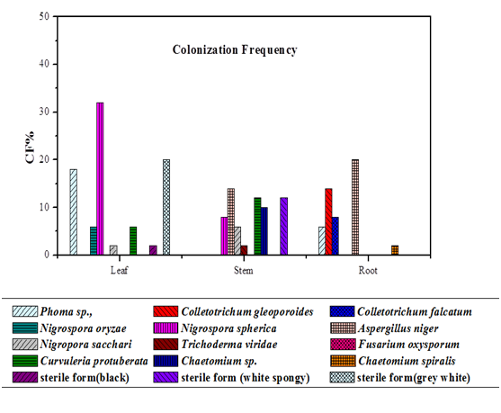 Colonization frequency of sporulating and sterile forms of endophytes isolated from all the organs of Mukia maderasapatana (L) M. Roem was determined (Figure 4). However, the overall colonization frequencies differed with different organs. The number of species occurring in the stem, root and the leaf vary in each segment. The root segment was more densely colonized by the endophytic fungi as evidenced by the total CF% which was found to be 86, 64 and 92% for leaf, stem, root respectively. Similar results were obtained in F. benghalensis.7
