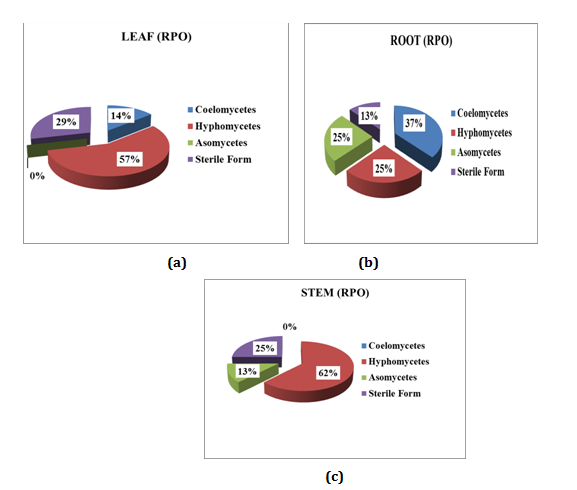 Figure 5 Relative percentage of occurrence of endophytes in different segment of the plant: (a) Leaf; (b) Root; (c) Stem.