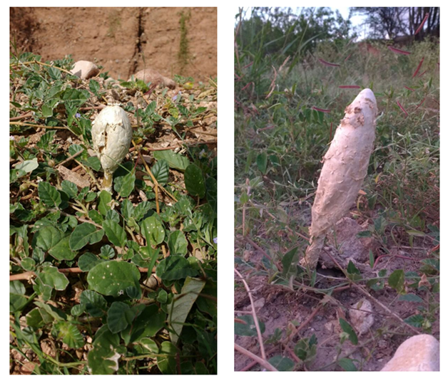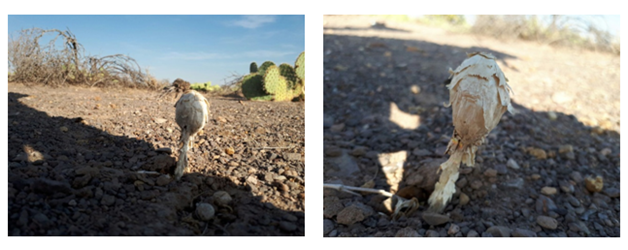 Podaxis pistillaris, with an oval-shaped periodium, rigid and woody stipe and very dark spores 10-15mm in diameter, grows in various desert areas of the planet.1,2 Figure 1, 2 shows fresh and dry specimens from Cuicatlán, Oaxaca, Mexico, an area considered to be one of the southernmost semi-desert in the Neartic.3