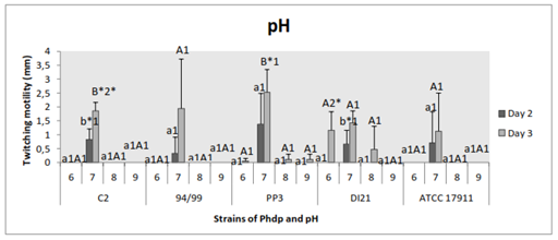 Figure 3 Effect of pH on twitching motility of the Phdp strains tested: C2, 94/99, PP3, DI21 and ATCC 17911.