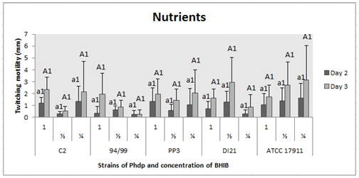 Figure 4 Effect of nutrients on twitching motility of the Phdp strains tested: C2, 94/99, PP3, DI21 and ATCC 17911.