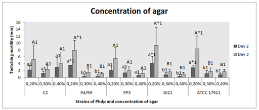 Significant increased motility was observed when the concentration of agar was lower (0.2% w/v) in strains 94/99 (p˂0.02), DI21 (p≤0.05) and ATCC 17911 (p≤0.05); the other two strains also moved larger in 0.2% agar-medium, but with no statistical significance (p˃0.05) (Figure 6). Significant difference between days of incubation was not detected (p˃0.05) (Figure 6).