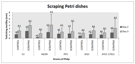 Figure 7 Effect of scraping the area of bacterial shift and attachment on twitching motility of the Phdp strains tested: C2, 94/99, PP3, DI21 and ATCC 17911