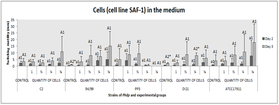 There were no significant differences between the groups “control” and “presence of cells in the medium” (p˃0.05) and between the different dilutions of cells (p˃0.05), for any strain. In the case of strains 94/99, DI21 and ATCC 17911, displacement best values seemed to be associated with presence of cell but in a lesser proportion, whereas for strain PP3 it was the opposite, displacement was not observed at 1:8 factor- dilutions. Strain C2 had groups with similar results (p˃0.05) (Figure 8). Significant differences between days of incubation in groups “control” (94/99 and DI21) (p≤0.05) and “1:4 factor-dilution” (DI21) (p˂0.01) were obtained (Figure 8).
