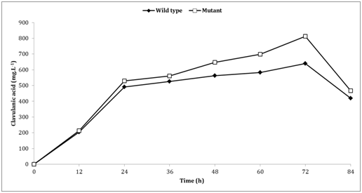 Figure 1 Comparison of clavulanic acid production between the mutant and wild-type strains cultivated in semi-synthetic mediums GSPA..