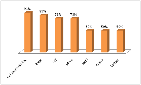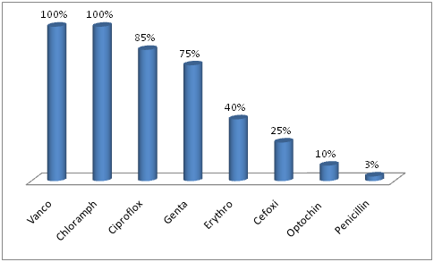 All Gram negative organisms showing 91% sensitivity to cefoperazone+salbactum combination followed by imipenem (85%), piperacillin+salbactum(78%), meropenem (78%), netilimicin (50%), amikacin (50%) and ceftazidime (50%). For Gram positive organisms all were sensitive to vancomycin and chloramphenicol followed by ciprofloxacin (85%), gentamicin (75%), erythromicin (40%), cefoxitin (25%), optochin (10%) and penicillin only (3%). These results signify the varying levels of drug resistance amongst the gram positive and the gram negative microbes, and the need to control the spread of these resistant strains before they reach the alarming levels in this region. Among the gram negative bacilli a general decline in the sensitivities to all groups of drugs was noticed. The simultaneous decline in sensitivities to different group of drugs can be correlated to the rampant indiscriminate use of antibiotics leading to a large scale drug resistance. As observed with the gram negative bacilli, a similar pattern of increasing drug resistance was seen among the Staphylococcal species, Streptococcus species. However, fortunately no vancomycin and chloramphenicol resistance were detected. As in Gram negative bacilli, cefoperazone+salbactum combination and carbapenems had very good sensitivity but they have side effects also. However seeing the predominance of gram positive cocci particularly Staphylococcus aureus with alarming rates of methicillin resistance (75%), suitable antibiotics should be given after sensitivity report. Stress should be given on the restrained and rationale use of antimicrobials both in and outside the hospital.