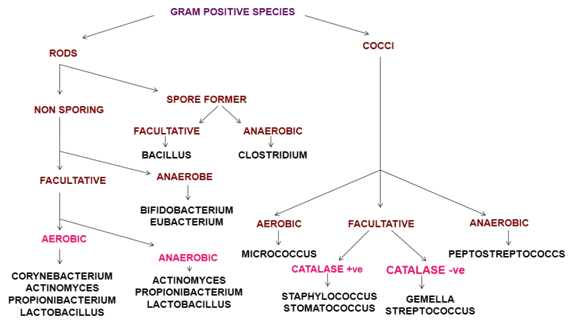 Classification system of bacteria discovered by Gram in 1884, allows a large proportion of clinically important bacteria to be classified as either Gram positive or negative. The following flow chart depicts the classification system of Gram +ve species in detail (Figure 1).