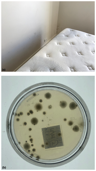 Figure 3 (A) Tenancy related contents mould exposure causing the edge of mattress to become damp due to rising damp across the wall in a ground floor apartment. The mattress did not show any signs of growth and appeared normal in appearance. (B) The corresponding petri plate (bottom side view). Species types included: Aspergillus sydowii, Aspergillus fumigatus, Chaetomium. The Hygiene rating was assessed overall as: ELEVATED Hygiene = 26-59 CFU/Plate + prevailing species using the AMG 2010 Guideline and Significant (poor) using the Purdue University RODAC hygiene rating scale. This is a FAIL result.