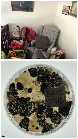 Figure 5 (A & B) shows an example of contents that have been moved from room to room when the Insurance-appointed contractors have first attended following a burst pile and extensive indoor flooding. Many months later as the insurance claim started, then stopped for various reasons, the owners became concerned that their daughter who had an immunosuppressive condition was reacting to her toys. From time to time the parents removed toys from the flooded home and took them to their temporary accommodation. Sampling was conducted to confirm or refute if the contents were in fact contaminated which was vigorously denied by the first responders sent in by the Insurer. Environmental exposure to fungi is known to compromise the respiratory tract even during health and create a cycle of inflammation that can create dysbiosis that is perfect for aspergillosis.30