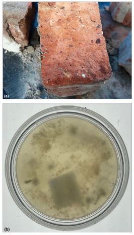 Figure 6 ((A) A brick was excised from the wall and cracked open with a single blunt force to its edge. Note the darkening to the left-hand side of the brick showing the moisture gradient that extends inside. (B) The inside surface was then immediately sampled with a RODAC plate (bottom side). Species types included: Scedosporium, Rhizopus, Aspergillus sydowii, Chaetomium, Bacteria, Candida sp., Unidentified fungus, Unidentified yeast, Penicillium brevicompactum. Number of colonies (either fungi and/or bacteria) showing evidence of confluence. Therefore, accurate numbers cannot be assessed and is very likely to be much higher than can be measured. The Hygiene rating was assessed overall as: HIGH (contaminated) Hygiene =>60 CFU/Plate + dominant species using the AMG 2010 Guideline and >50 colonies: Heavy (unacceptable), TNTC: Too numerous to count (unacceptable) using the Purdue University RODAC hygiene rating scale. This is a FAIL result.