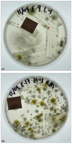 The following examples illustrate in brief some of the diverse applications where surface sampling has been used as part of mould and water damage inspections. The pairs of photos show the region of interest within the building and the viable growth (or not) that developed at culture. I will provide some background context to this information so the reader can appreciate the nature of the foreseeable problems. Figure 1 (A & B) is from a new home construction where the owner was concerned about the rainwater affecting flooring and timber framing due to the fact the roof did not go on in a timely manner during construction. The builder was of the view that the affected materials would naturally dry out and would soon be sheeted over with plasterboard wall linings. The owners were therefore concerned about mould being effectively sealed into their wall cavities and flooring. The destructive impact of fungal lignin and cellulose degrading enzymes causing timber damage is well known.26,27 Figure 2 (A & B) is from a home where the building warranty was about to expire. The owners had noted that one of their basement rooms was showing severe signs of efflorescence. There was also a strong odour and water could be seen from time to time, leaking through the wall from above. All items of personal property stored in this room showed visible signs of mould. The abutting room was used as an office and the owners were concerned about transfer of mould into that room and sick building syndrome as well as the fact the room showing efflorescence was obviously leaking and a defect. These salt deposits are commonly referred to as efflorescence and are often considered not to be ‘alive’ and just a ‘chemical reaction’. But an important paper28 by Masaphy et al.28 confirmed that efflorescence deposits are extensively contaminated with fungi. Growth in controlled experiments further showed that acids released by the growing fungus were responsible for the biodeterioration effects.
