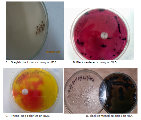 There are few biochemical tests which confirmed the presence of above colonies of Salmonellae species. Salmonella on triple sugar iron agar produces hydrogen peroxide and blackening at the butt and slant. Hence H2S positive and also form yellow butt on TSI which means produces acid. Other biochemical reactions like urease negative (no color changed), Indole test negative (Yellow color at surface), Voges-Proskauer test negative (No color change), Methyl Red Test Positive (Diffuse Red color), Simmon Citrate Negative (No growth no color change or green in appearance).8