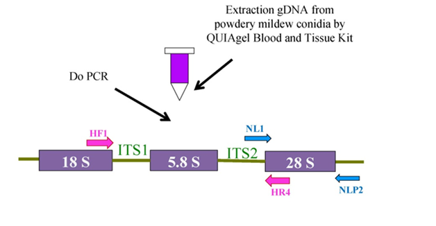 Figure 1 Scheme for using primers pairs to PCR or sequence ITS or 28S rDNA of powdery mildew fungus from conidia (PPRI 2004).