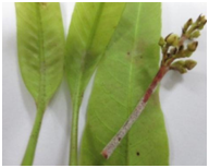 Pathogenicity for E. quercicola on mango was confirmed through inoculation tests by gently sweeping conidia by pen brush from diseased mango leaves onto 7-10 days-old fresh mango leaves. These ten inoculated mango leaves were kept on floating on the water surface in ten plates separately. Ten plates with ten non-inoculated fresh mango leaves were used as controls. All was kept in chamber room with optional conditions including temperature 25˚C; relative humidity 90%; light intensity 12000lux as method of Pab et al.9 Inoculated leaves developed significant symptoms almost after 3 days; whereas the control leaves remained symptomless. The E. quercicola present on the inoculated leaves was morphologically identical to that observed on the diseased original leaves; with same PCR result; fulfilling Koch’s postulates.