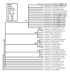 The phylogenetic tree based on analysis ITS rDNA sequences in Figure 3 clearly indicated that powdery mildew on mango (Mangifera indica) in Vietnam belonged to E. quercicola clade with strong bootstrap support (both 99% in MP and in ML analysis (Supplemental Figure 1). Meanwhile; in phylogenetic analysis carried out by Takamatsu et al.2 powdery mildew fungi on belonging to E. quercicola clade with 99%BP values support. Especially; in our study; powdery mildews on C. reticulate (mandarine); M. indica (mango); H. brasiliensis (para rubber tree) in Vietnam; all belonged to E. quercicola clade.