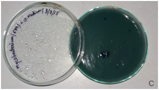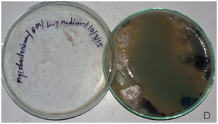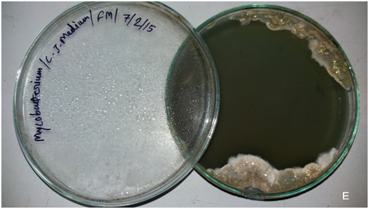 The colonies of M. tuberculosis appeared as dry, rough, raised, irregular with wrinkled surface, creamy-white initially becoming yellowish or buff coloured on further incubation (Figure 3E). The colonies of M. bovis appear as flat, smooth, moist, white or non- pigmented and break up easily. The colonies of M. cosmeticum appear as moist, non-pigmented or whitish, smooth surfaces and edges, are domed and are scotochromogenic, it appears on L. J. Agar within 3 days of incubation in aerobic environment.