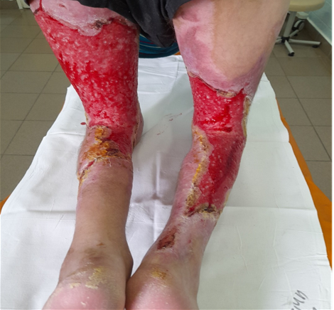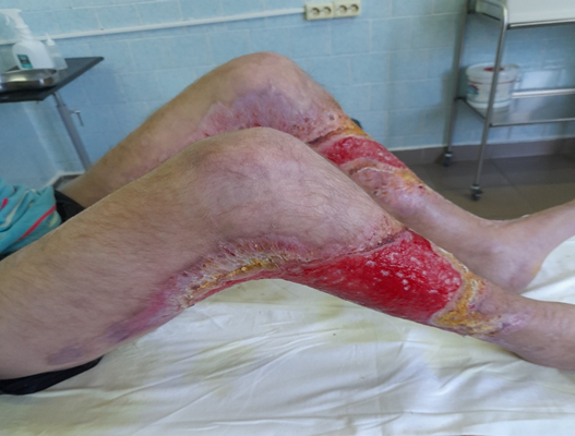Diagnostics and verification of burn wound microorganisms were performed during treatment. Seeding, cultivation, identification and determination of antibacterial sensitivity were performed in accordance with the current instruction approved by the Ministry of Health of the Republic of Belarus on 19.03.2010.14 The sensitivity of isolated strains of microorganisms was determined by the disc-diffusion method or with the help of semi-automatic microbiological analyzer ATV - expression and "Vitek - L compact 30". The studies were conducted using nutrient media, antibacterial disks from HIVEDIA (India) and test systems from BioMerieux (France). In microbiologic examination, Staphylococcus aureus was most frequently isolated from postburn wounds (99% probability), which was sensitive to ciprofloxacin (minimum inhibitory concentration (MIC)1), gentamicin (MIC >=0.5), levofloxacin (MIC 0.25), quinupristin (MIC 0.5), linezolid (MIC 2), clindamycin ( MIC >=0.25), vancomycin (MIC 1), tigecycline (MIC 0.25), rifampicin (MIC >=0.5), trimethoprim (MIC >=10). Resistance was noted only to benzylpenicillin (MIC >=0.5). Thus, Gram-positive cocci (Staphylococcus aureus) were sensitive to most antibacterial drugs, which most likely indicates their out-of-hospital origin. In the department, directed antibiotic therapy was performed using ciprofloxacin and gentamicin in therapeutic doses. After epithelialization of postburn wounds, 3-4 ulcers remained on both limbs with dimensions of 2*2.5 cm. At repeated bacteriologic examination Klebsiella pneumonia ssp pneumonia was isolated (99% probability), sensitive to meropinem (MIC 1), minocycline (MIC 4), tetracycline (MIC 2), tigecycline (MIC1), trimethoprim (MIC 4). Resistance was established to most of the tested antibacterial drugs: ticarcillin/clavulanic acid (MIC>=128), piperacillin (MIC >=128), cefuroxime (MIC >=64), cefixime (MIC >=4), ceftriaxone (MIC >=64), cefepime (MIC >=64), levofloxacin (MIC >=8), chloramphenicol (MIC >=64). Antibiotic resistance of Klebsiella pneumonia ssp pneumonia, when the patient is hospitalized for a long period of time, may indicate its hospital origin, hindering effective treatment.15 We cannot exclude the fact that the widespread use of antibiotics leads to the growth of antibiotic-resistant strains, since traumatology and combustiology are areas of medicine in which systemic antibacterial therapy is usually carried out for a long time with a combination of drugs in high doses.