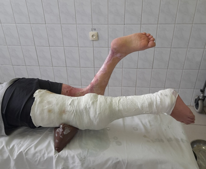 Patient A, 37 years old received deep burns from the flame of a fire on 01.12.2022 and was treated in the district hospital from 07.12.2022. During the period of treatment he underwent stage necrectomies, dressings, autodermoplasty. No contracture prevention measures were performed. He was admitted to the City Clinical Emergency Hospital of Grodno on 11.04.2023 with the following diagnosis: thermal flame burns of the lower extremities, buttocks S 20% (11%) 3A-B stage: flexion contractures of the knee joints 3 stage. Locally, both limbs of the patient were in a 90-degree knee flexion position with post-burn infected wound surfaces on the shins and posterior thighs (Figures 1,2). On 14.04.2023, a surgery was performed: one-stage free skin grafting with a split graft on the area of 10% and more, autodermoplasty with a free split flap of the lower limbs wounds of 11% body surface area (BSA). On 24.05.2023, plastic surgery of burns consequences was performed: autodermoplasty with a free split flap of post-burn wounds of both lower limbs BSA 2%.