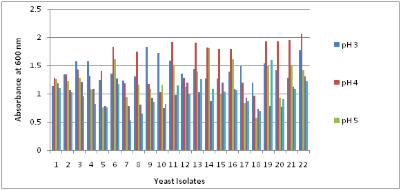 The pH of the fermentation medium could highly affect the rate of ethanol production by microbes. Yeast preferred acidic condition and its optimum pH was 5.0 to 5.2, but brewing and distilling strains were capable of good growth at pH range approximately 3.5 to 6.22 The yeast isolates in this research work were able to grow at pH range from 3 to 6 and their maximum growths were observed at pH 3 and pH 4. So, they were suitable for use in fermentation that was usually performed at acidic condition (Figure 1) (Figure 2).